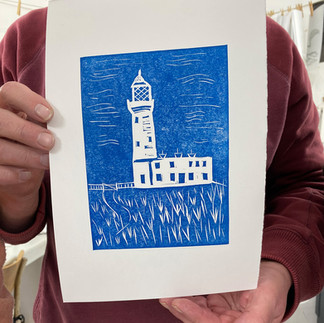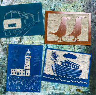 Kicking off my first linocut workshop of the year with a private booking and four wonderful prints. Tim carved a print of a diesel train; Alsion’s print was based on her drawing. Andrew created a linocut print of Flamborough Lighthouse, and Jo created a print of an ark at sea.