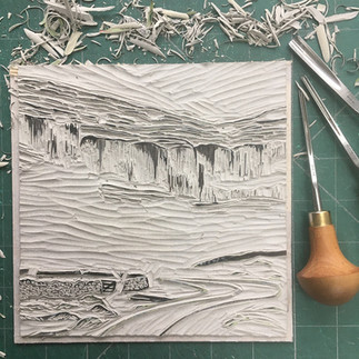 Carving a lino block for the green grass and vegetation on the limestone.