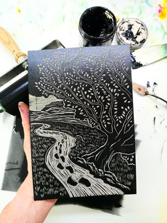 Michelle loves exploring the British countryside by bike or on foot, camera in hand, capturing ideas for her next linocut prints. Back in her garden studio, Michelle creates simple but stylised silhouettes based on her photographs, and hand carves these shapes into lino. She hand prints with an etching press, using oil-based inks to create tonal blocks of colour.
